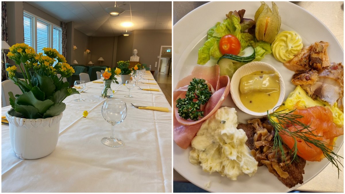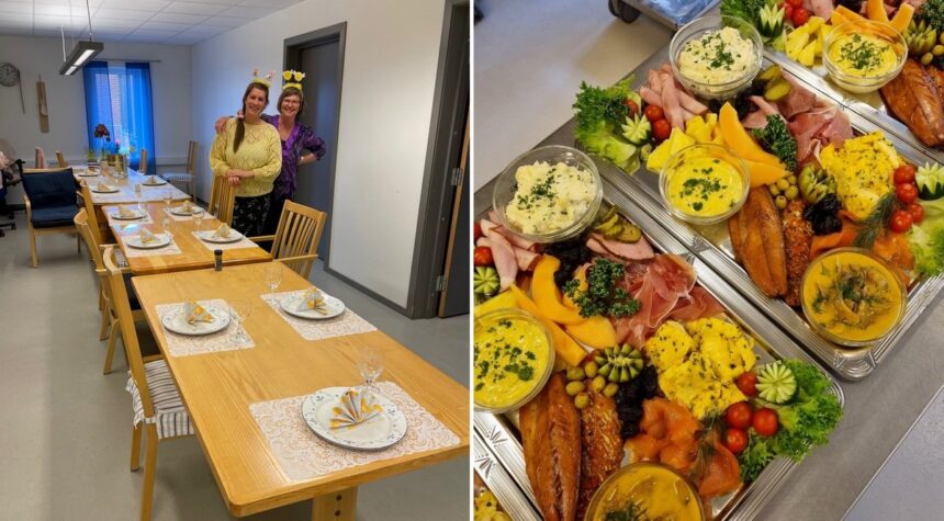 I påsken er det tid for fellesskap og kos, også på sykehjemmene. Alle bordene var påskepyntet etter alle kunstens regler, hvor koldtbordet besto av blant annet fisk, spekemat og salat.