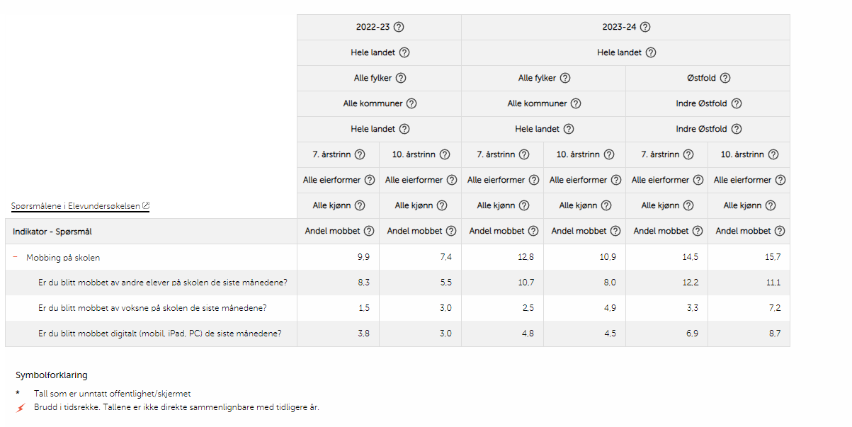 - Mobbing digitalt siste måneder, 7,5 ned til 6,9 på 7. trinn – fra 3,6 til 8,7 på 10. trinn